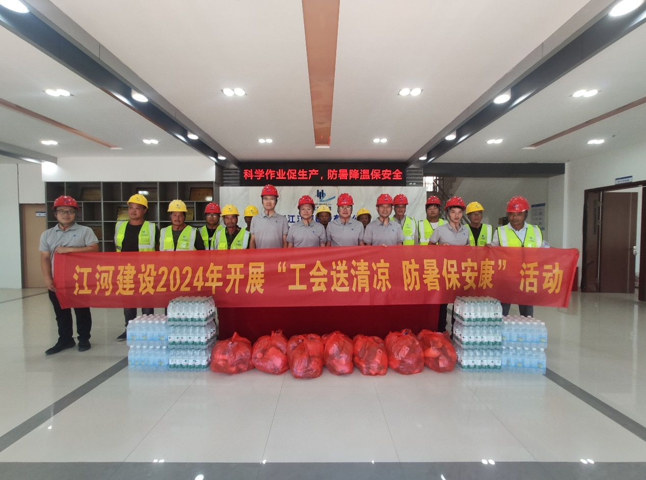 盛夏焦月,驕陽似火,江河建設各重點在建工程項目正在有序推進,一線的職工們備受“烤”驗。為有效改善職工生產生活條件,認真做好高溫天氣職工勞動保護工作。連日來,江河建設黨總支、工會組織開展“工會送清涼,防暑保安康”為主題的高溫慰問活動,成立有工會、總師辦、工程部、安全部等負責人組成的“紅+安全”慰問組,帶著袁偉忠董事長、陳宋江總裁的關懷問候和委托,深入全國各地的項目施工現場,慰問奮戰在高溫一線的項目工人,為其送去礦泉水、毛巾、風油精、西瓜、飲料、藿香正氣水等防暑降溫物品,并為他們的辛勤付出表示感謝。