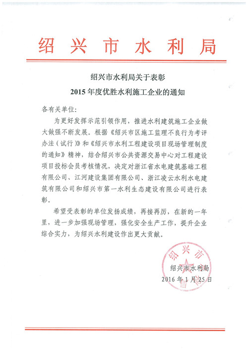 我公司榮獲紹興市水利局“2015年度優勝施工企業”稱號